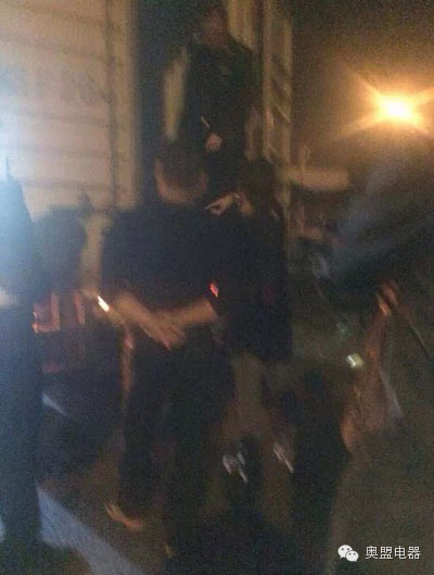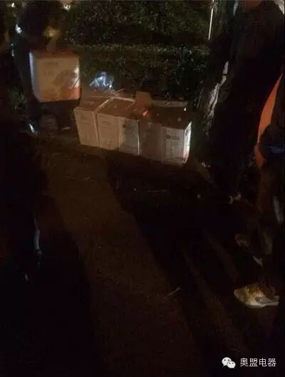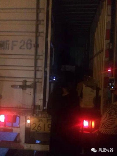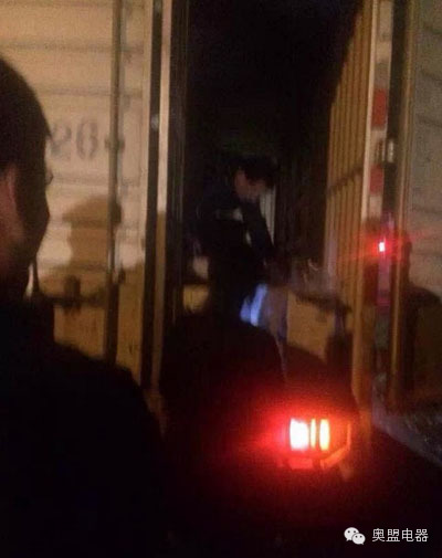 拦下了一辆物流车,上车检查后发现可疑假冒品牌电器,并把假货搬下车,进一步查看。