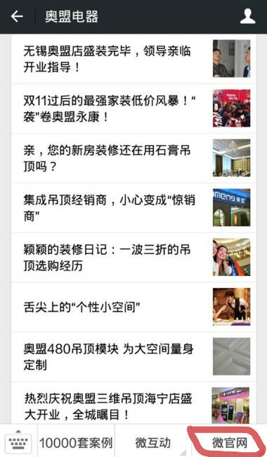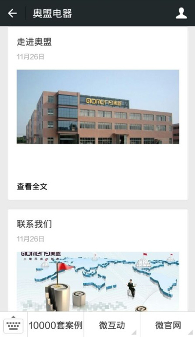 只需进入奥盟电器的订阅号,点击右下角“微官网”,即可进入微官网平台。点击微官网,五大板块映入眼帘,会有更多不同的界面效果,带给您不同的视觉体验感受。