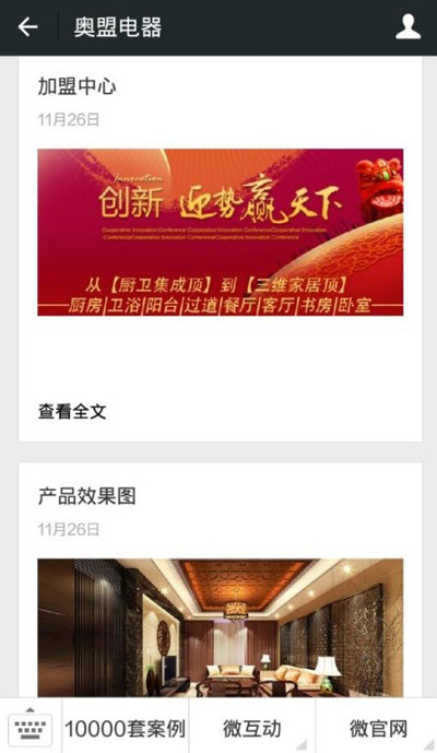 三维吊顶开创者【奥盟电器】手机微官网已经正式跟全国各地的经销商、消费者们见面了。