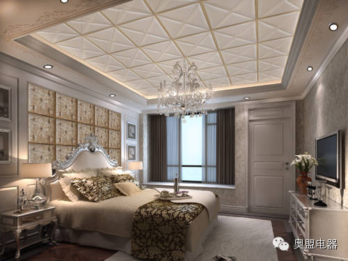 卧室吊顶:袭欧式简约或古典的轨迹,融入欧洲雕刻大师的设计灵魂,配合吊顶专用型材,错落有致,更显奢华。