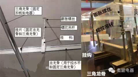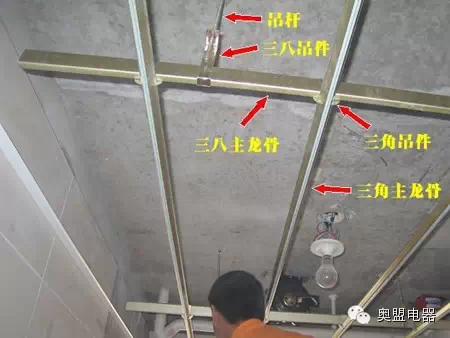 吊顶框架也就是金属板材最上面的隐藏部分。表看这小小的框架貌不惊人,最容易出问题的就在这了!框架要是松了,龙骨架绝壁扶不住,会出现吊顶变形、下沉甚至整板塌落的事故。(所以说啊,安装框架部分千万不能马虎啊! 辅料一定要选用镀锌钢材。)