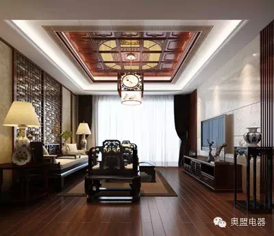 中式华丽吊顶以其雍容、古典、大气为特点。中式华丽吊顶多用井格式或者直线式的造型,井格式吊顶井利用井字梁因形利导或为了顶面的造型制作假格梁的,配合灯具以及单层或多种装饰线条进行装饰,丰富天花的造型或对居室进行合理分区,直线形吊顶则多用内发光配合,突出空间清晰、顺畅亮丽感。