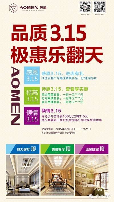 奥盟三维吊顶“品质3.15,极惠乐翻天”促销活动将于2015年3月10日——2015年3月25日将在奥盟全国300多家专卖店中同步开展。活动具体信息可以咨询当地专卖店或访问奥盟电器官网!