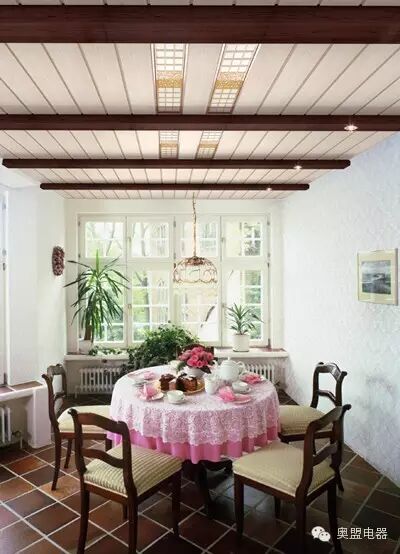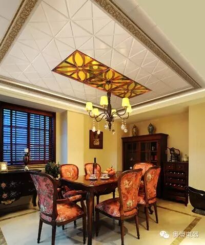 餐厅里的色调很重要,暖色的家具和暖色的吊顶可以增加食欲哦~