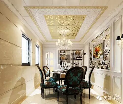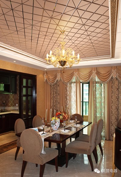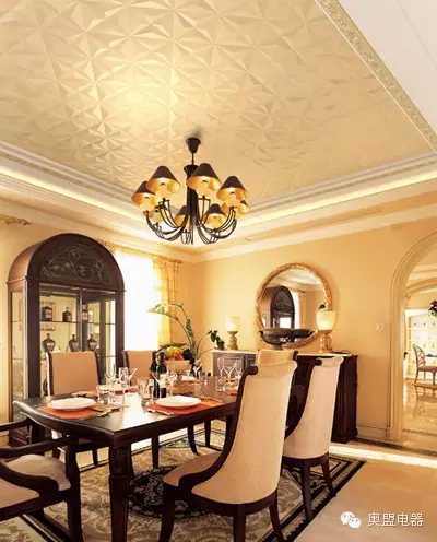 这款餐厅吊顶好像一片柔和的金色祥云罩在头顶,给人舒缓柔和的感觉,复古花纹的餐椅点缀出活力。