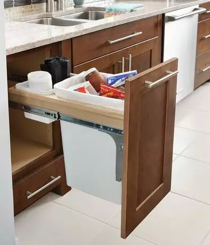 垃圾桶收在橱柜里,避免外露细菌横飞。旁边摆个盒子存放垃圾袋,方便更换。