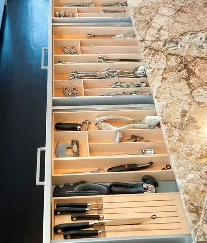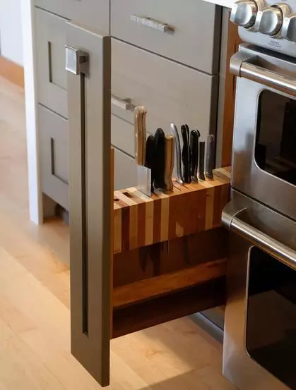 刀具本就不应该外露在小孩子也触手可及的料理台上。收在成年人腰部高度的第一层橱柜里,用格子根据刀具大小分类放好,方便拿取。